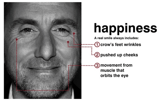 Genuine smiles have bigger creases around the mouth & eyes. The mouth turns into a generous “U” shape.